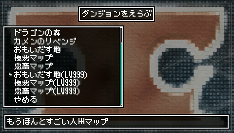なんと「おもいだす地」「極悪マップ」の全階層と「鬼畜マップ」の1~3階が敵レベル999の状態でプレイできるようになりました。