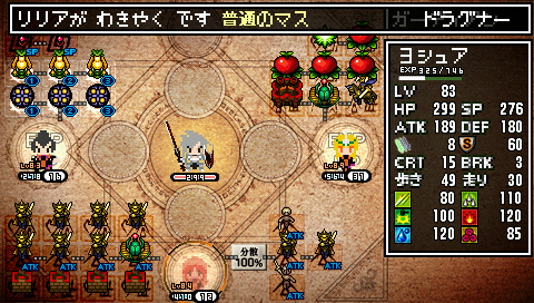 そして今回は武具の称号「ドレイン」に注目。敵に攻撃を当てると、与えたダメージに応じてHPが回復するんですが、武具の種類によって回復する場所が違い、武器なら魔装陣の左側、盾なら右側、鎧なら下側に配置されているわきやくのHPが回復します。(ゲーム内の説明はしゅやくから見てのもの。魔装陣の下側に配置されたわきやくはしゅやくが正面から受けたダメージを肩代わりする)