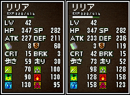 左はノーマルな市販品(ライキリ、まほうの法衣、二律防壁)装備時、右が今回作った「神威99」装備時のステータスです。