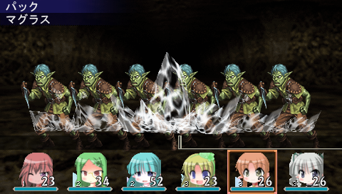 地下1階でもラグラスを使えば大体の敵は倒せます。時々敵の攻撃でHPが半減するなどヒヤッとする場面もありましたが、犠牲もなくゴブリンの巣へ到着。早速ゴブリンどもと戦います。
