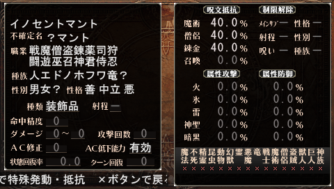 また地下4階以降に降りると、石化ブレスをもつコカトリスや首切りと武器防具破壊、さらにつばめ返しまで持つグリフォンに3回行動をかますヒドラが難敵。特にグリフォンは、下手に武器攻撃すると首がすっぱんすっぱん飛びますんで、ブレスや魔法で撃破したいところ。