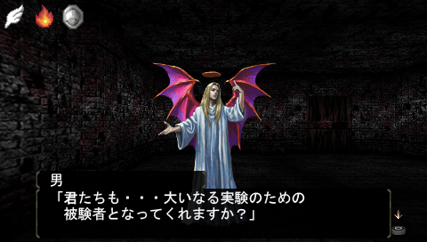 地下2階に降り、西のほうを探索していると、実験室的な場所にたどり着きました。なにやら男が死体に何かの薬品を振り掛けて実験をしている様子。