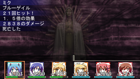 十分攻撃が通るようになったら、回復しつつ総攻撃。ミクやカイト、テトの攻撃で2000以上のダメージを与えられるようになりました。よし、これならいける!