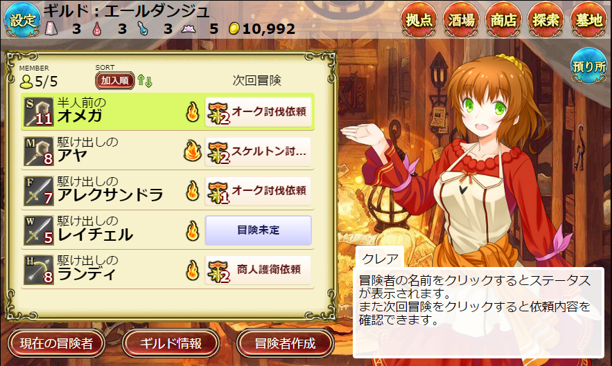 我がギルド「エールダンジュ」には、現在5人の冒険者が在籍しています。(初期状態のMAXで、課金で登録枠を20人まで増やせる)