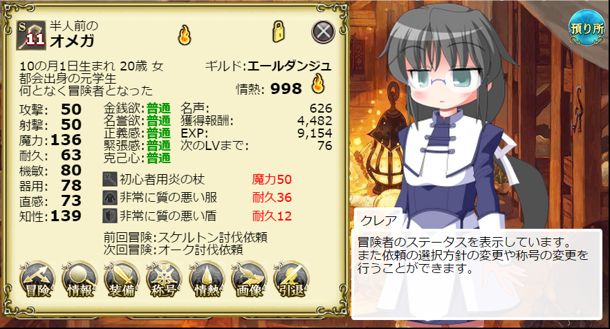 リーダーのオメガ。何となく冒険者になった元学生。出自や動機は、能力値や欲望(情熱を保つために重要なステータス)に影響を与えるので結構大事です。