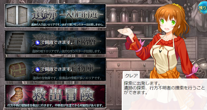 行方不明者が出た場合は、「探索」のメニューに「救出冒険」の項目が追加されます。ここからパーティーを組んで救出に向かう事が出来ます。