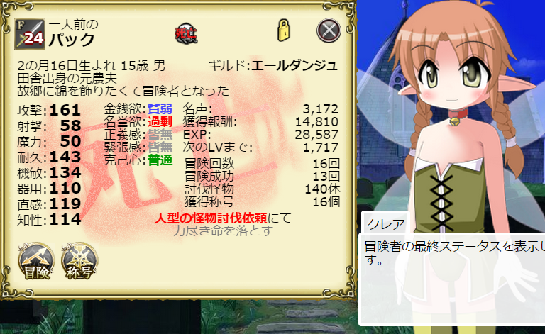 装備はほぼ適正レベルのものが揃ってます。情熱も高い数値を保っており、まだまだ活躍してくれそうです。