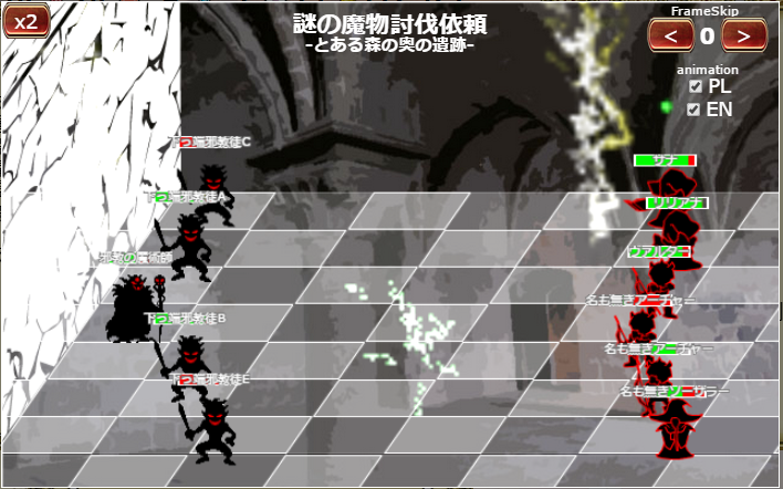 さて「謎の軍団を撃退せよ!第二幕」の内容ですが、以前暗躍していた謎の魔物たちがまた活動を開始、辺境の村々を襲ったので討伐せよ…というのが最初の目的だったんですが、最終日になって、こいつらが実は魔王復活を目論む邪教の魔術師が作った魔法生物だったことが判明。本拠地である遺跡に攻め込んで魔術師を討伐する、というのが最終日の冒険の内容でした。