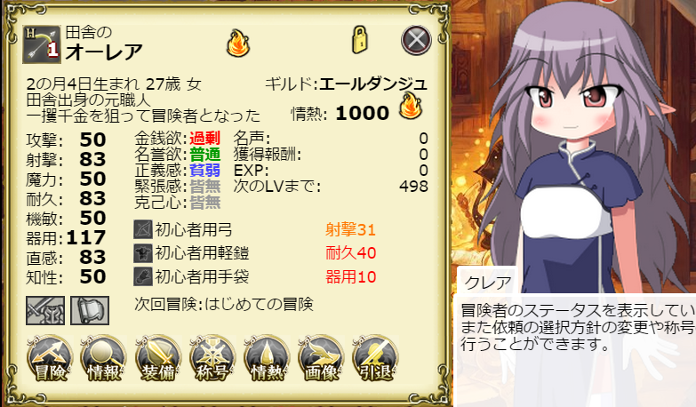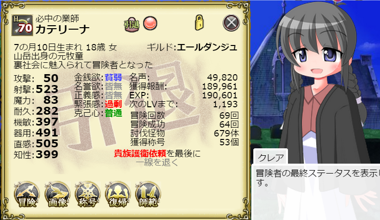 カテリーナはランク5の射撃の師範になりました。彼女を師範につけた場合、ギルドの現役冒険者全員の射撃のが5%(または最低保障として10)アップします。