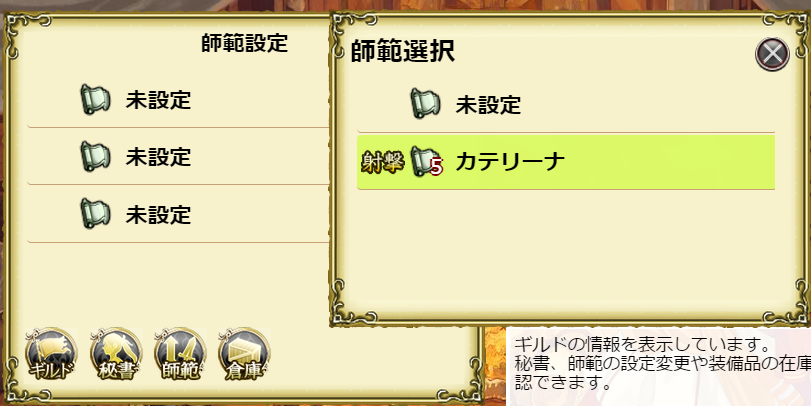 引退冒険者のステータス欄で「師範」をクリックすると師範候補にする事ができ、ギルドの「師範」の項目でギルド付の師範にする事ができます。
