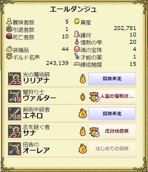 また引退した冒険者は、師範(候補)をやっていない時であれば、情熱の雫を3つ使うことで現役復帰させることも可能です(情熱は500まで回復します)。