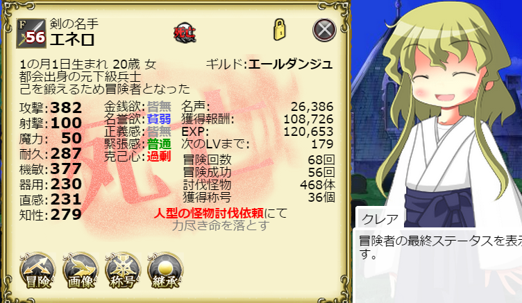 先日ヴァルターが引退して(敏捷4の師範になりました)、エネロが死亡。二人ともよく頑張った…