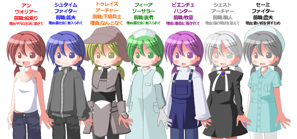 ステータス画面を一々撮影するのも面倒なので、全員の名前とクラス・前職・動機と画像をまとめたものをアップしときます。ご覧の通り7つ子です。