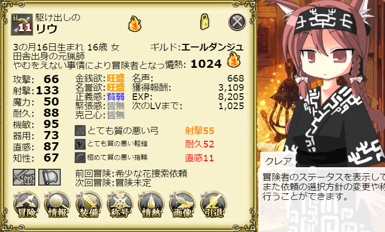 冒険者には武器ごとに熟練度が設定されていて、低いと武器の性能が十分引き出せない場合があります。(武器の攻撃力がオレンジ色で表示されてるのがそれ)