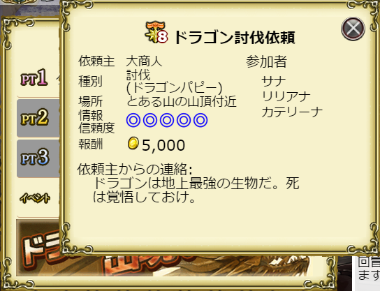 4月4日~6日の間、ドラゴン討伐イベントが発生。メンバーの力量を計る意味も込めて、挑戦してみることにしました。