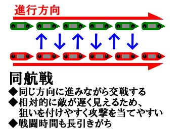 同航戦とは、平行に並んだ状態でお互いが同じ方向に進みながら撃ち合う状態です。車に乗っているときに同じ方向に進む車が遅く見えるのと同じ理屈で、この状態だと敵の動きが遅く見えるので狙いをつけやすく、また同じ方向に進んでいるので接敵時間が長くなる傾向あります。