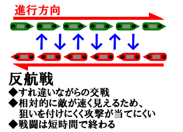 反航戦は同航戦と真逆で、お互いが逆の方向に進み、すれ違いながら撃ち合う状態です。