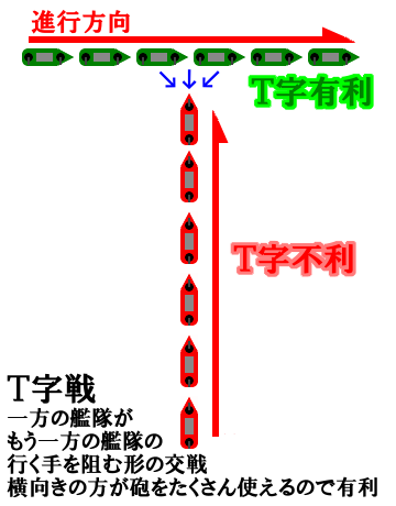 艦隊の進行方向に相手の艦隊が行く手を阻むような状態がT字戦(丁字戦)で、このような形に持っていく戦い方をT字戦法といいます。