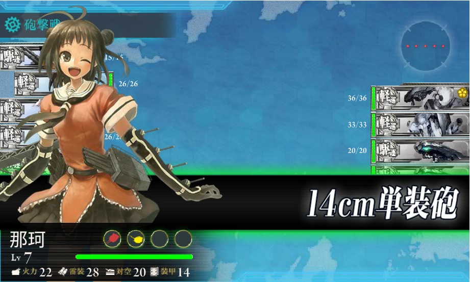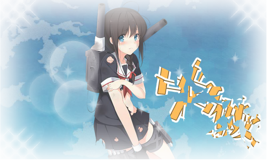 上の画像は、最初に仲間に出来る艦娘の一人、「電」(いなずま)。こんな感じで、女の子に大砲やら何やらをくっつけた姿で表現されています。