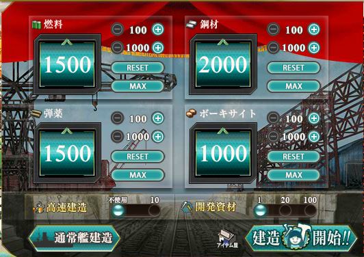 燃料1500/弾薬1500/鋼材2000/ボーキサイト1000、最高値はそれぞれ