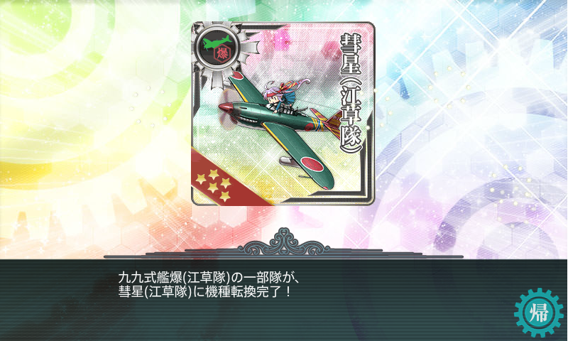 これにも「機種転換」があり、任務を受けた状態で九九式艦爆(江草隊)を装備させた艦娘を第1艦隊旗艦に置き、彗星を2機破棄すると…