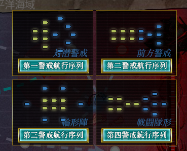 右下に説明が書かれているのでわかりやすいですが、第一警戒航行序列は単横陣、第二は複縦陣、第三は輪形陣、第四は単縦陣と同等と考えておけば良いでしょうか。