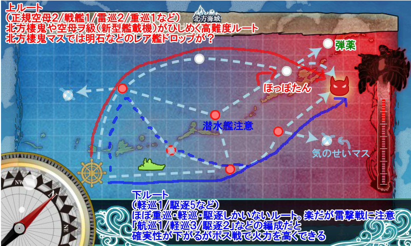 上ルートは空母系が2隻いると向かうルートですが、こちらには新型艦載機を搭載した空母ヲ級や、先日のイベントで登場した北方棲姫が待ち構えている高難度ルート。