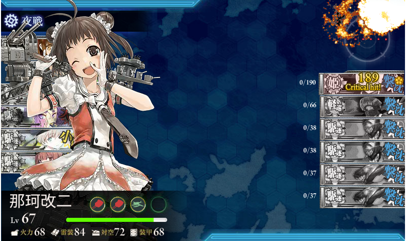 Gマスは夜戦になりますが、なぜか敵が対潜装備で固めており主砲を一つしか積んでないので連撃やカットイン攻撃は出してきません。一応夜偵や照明弾を用意しておくといいかも(ボス戦でも役に立つし)。