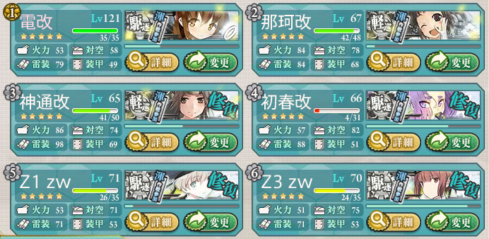 わたくしはこんな感じの艦隊で出撃。全員に主砲2つ持たせ、那珂ちゃんには夜偵、神通さんには照明弾、駆逐艦たちには電探を持たせています。