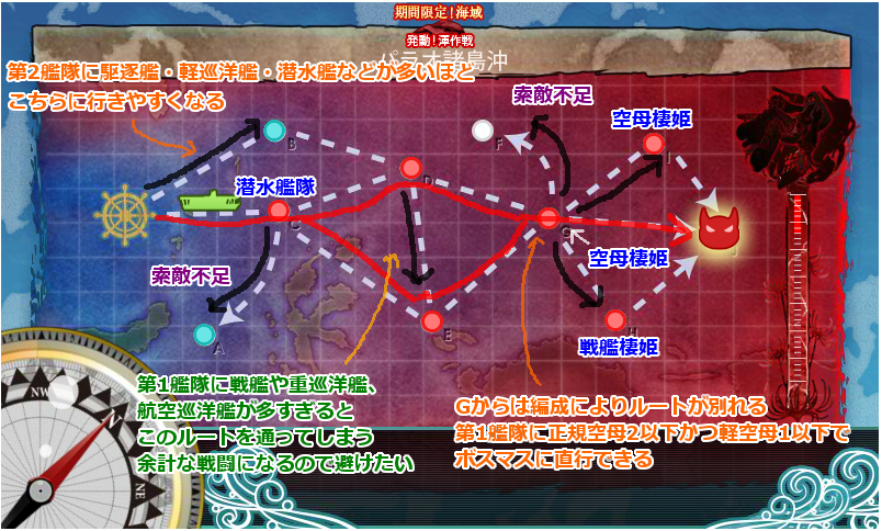 一つ目の分岐ですが、第2艦隊に駆逐艦や潜水艦などを多く入れておくと、戦闘の無いBマスに入る可能性があります。ただ、Cマスにいるのは命中率の低い潜水艦隊なので気にしなくても良いでしょう。