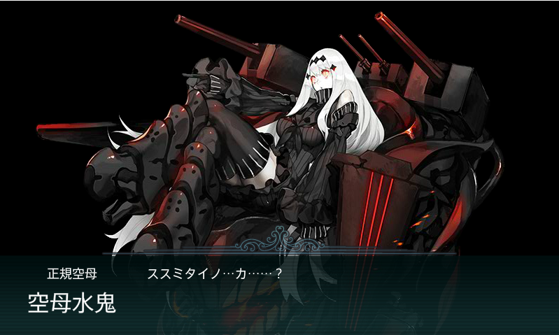 ボスは初登場の空母水鬼。空母棲姫よりさらに強く、HPは実に390。さらに空母ヲ級改(最終決戦時には装甲空母姫×2)もいるので制空権を取るには空母系が2~3隻は欲しいところ。水上打撃艦隊の場合は、軽空母2隻では制空権を取れるのか怪しいので、烈風ガン積みのあきつ丸改が欲しいところです。