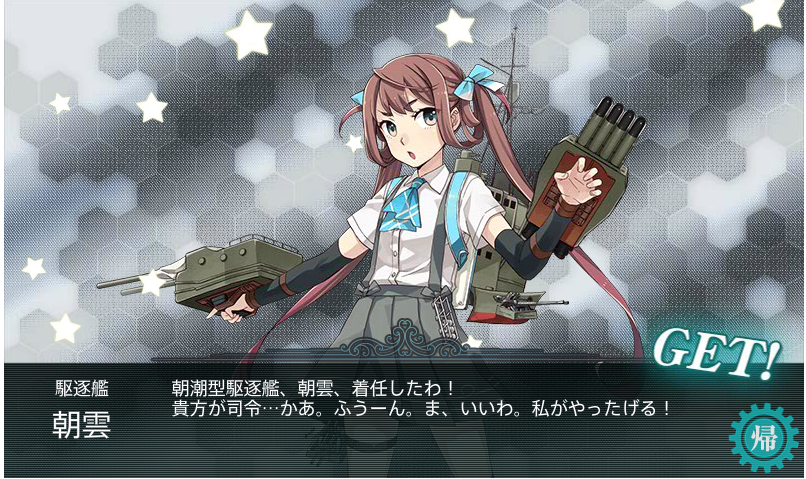 限定ドロップ艦の「朝雲」もE-4で入手できたので、明日から通常業務に戻ろうかと思います。