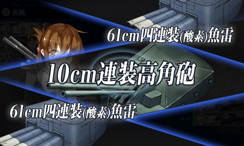 7についてですが、たとえば主砲と魚雷を1個ずつ装備した場合、こんな演出が表示されます。
