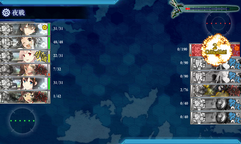 夜戦に持ち込むのは当然として、連撃だとダメージを与えづらいので、運が高い駆逐艦を揃えて魚雷カットインに賭けてみることにしました。