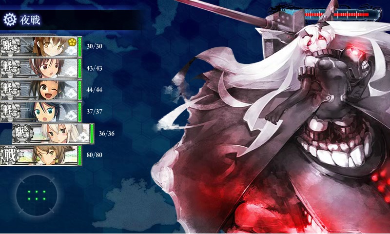 ところで、ボス戦(とボス一歩手前で北にそれた対空母戦)では、条件により夜戦が終わった後通常戦に移行することがあります。ボス戦の場合、敵艦の2番目か3番目が生き残っていることが条件のようです。
