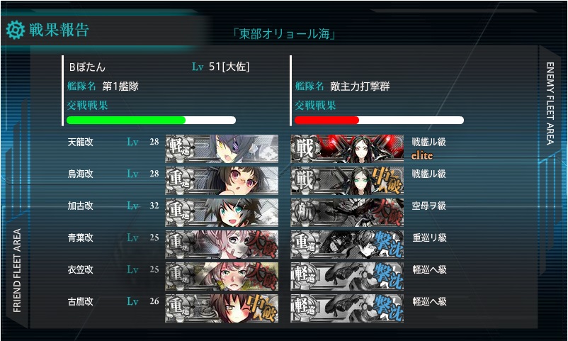 夜戦に持ち込むつもりでしたが、通常戦で青葉さんと衣笠さんが大破してしまい夜戦に持ち込めず、無念の戦術的敗北(評価C)。