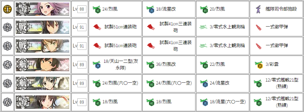 装備は、空母勢は艦戦を合計8個以上、第2艦隊には夜戦装備を。駆逐艦の1隻を対空カットイン仕様にするとグッド。