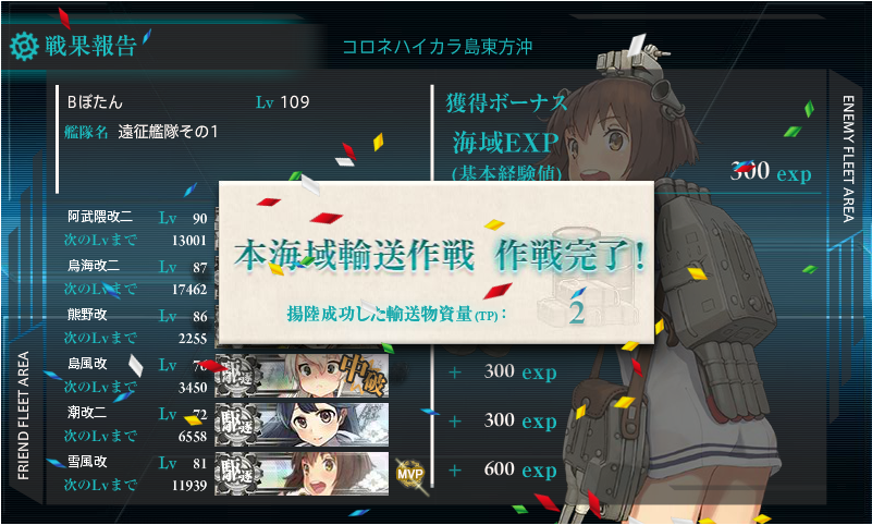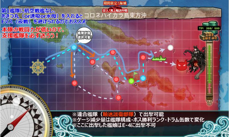 (1)あきつ丸改 Lv79 烈風改,零式艦戦53型(岩本隊),艦隊司令部施設(2)鈴谷改 Lv86 20.3cm連装砲,20.3cm連装砲,ドラム缶(輸送用),ドラム缶(輸送用)(3)不知火改 Lv70 ドラム缶(輸送用),ドラム缶(輸送用),ドラム缶(輸送用)(4)陽炎改 Lv70 ドラム缶(輸送用),ドラム缶(輸送用),ドラム缶(輸送用)(5)敷波改 Lv70 ドラム缶(輸送用),ドラム缶(輸送用),ドラム缶(輸送用)(6)若葉改 Lv71 ドラム缶(輸送用),ドラム缶(輸送用),ドラム缶(輸送用)(2-1)阿武隈改二 Lv90 甲標的,61cm五連装(酸素)魚雷,61cm五連装(酸素)魚雷(2-2)鳥海改二 Lv86 20.3cm(2号)連装砲,20.3cm(2号)連装砲,九八式水上偵察機(夜偵),照明弾(2-3)熊野改 Lv86 20.3cm連装砲,20.3cm連装砲,零式水上観測機,ドラム缶(輸送用)(2-4)島風改 Lv76 10cm連装高角砲,10cm連装高角砲,ドラム缶(輸送用)(2-5)潮改二 Lv72 61cm五連装(酸素)魚雷,61cm五連装(酸素)魚雷,ドラム缶(輸送用)(2-6)雪風改 Lv81 53cm艦首(酸素)魚雷,61cm五連装(酸素)魚雷,ドラム缶(輸送用)