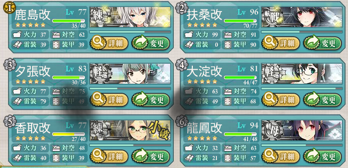 対潜担当は、装備スロットが4つある夕張・大淀・鹿島・香取を採用。