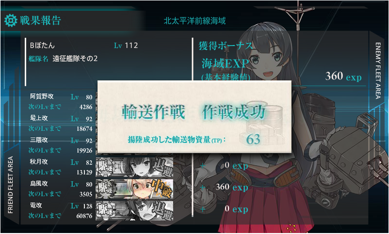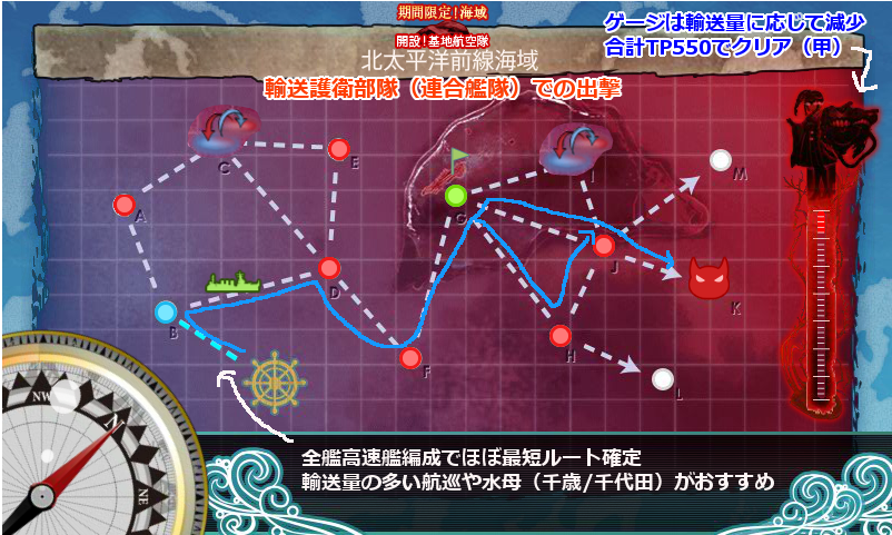 必要輸送量(TP)は難易度でも違いますが、甲作戦の場合は合計550以上でクリアとなります。