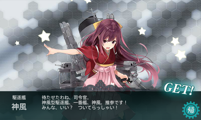 駆逐艦「神風」。睦月型の前級という事で性能もそれなり。衣装がどっちかというと軽空母っぽいですね。