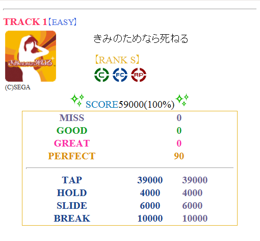 そんなこんなで順調にランクSを獲得。最近追加された「きみのためなら死ねる」に至っては、なんと人生初のALL PERFECTまで達成。