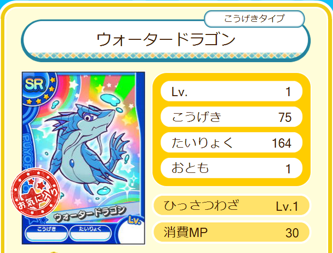 SRのウォータードラゴンがポロッと…!!どうしよう、イベントあと9日もあるのに…(違)まあせっかくなので、ふつうや辛口もプレイしてひっさつ技Lv上げでもしましょうかね、どうせ育てるんだし。