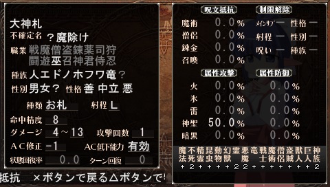 | ミユリ | 巫 | 57 | 211 | -3 | 火炎魔道(呪い解除・精霊倍打) 大神札(首切り+13%) |