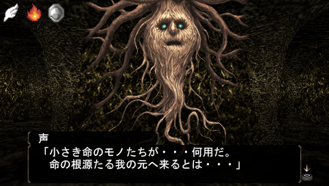 開けた部屋の奥に大きく膨らんだ根があり、そこに顔が浮かび上がって、テレパシーで話しかけてきました。