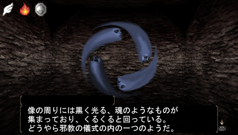 山羊の頭の像の上に、魂みたいなものがくるくる回っています。どうも邪教の儀式の一種のようです。