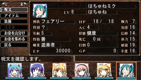 職業は遊楽者。ウィザードリィ外伝IIIのバードに相当する職業で、魔法使いの呪文と宝箱の罠外し、楽器の使用ができる他、タロットカードを使う事ができます。