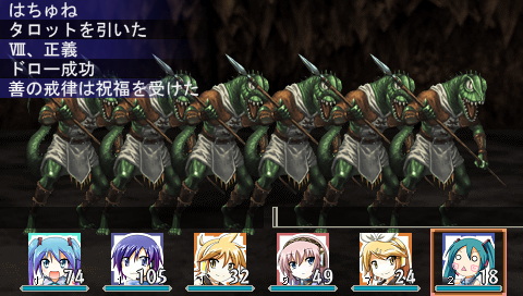 戦闘中にタロットを引くと、引いた絵柄によって様々な効果を発揮する事ができます(引く絵柄は自分で決められます。)ただし、失敗する(逆位置で引いてしまう)と効果が逆転したり何も起きなかったりするので要注意です。