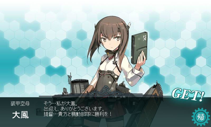 大鳳は「装甲空母」という特殊なカテゴリの艦娘で、他の空母系と違って中破状態でも艦載機による攻撃ができるという大きな利点を持ちます。装甲値も高く、他の空母系より経戦能力が少し高いと言えるでしょう。肝心の艦載機搭載数は18/18/18/7とまあまあの数値。