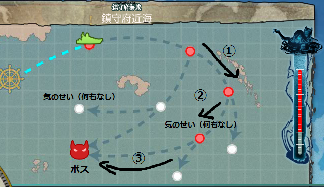 この海域の場合、ルート分岐条件がかなり明確に決められているようで、図に振った番号で説明すると